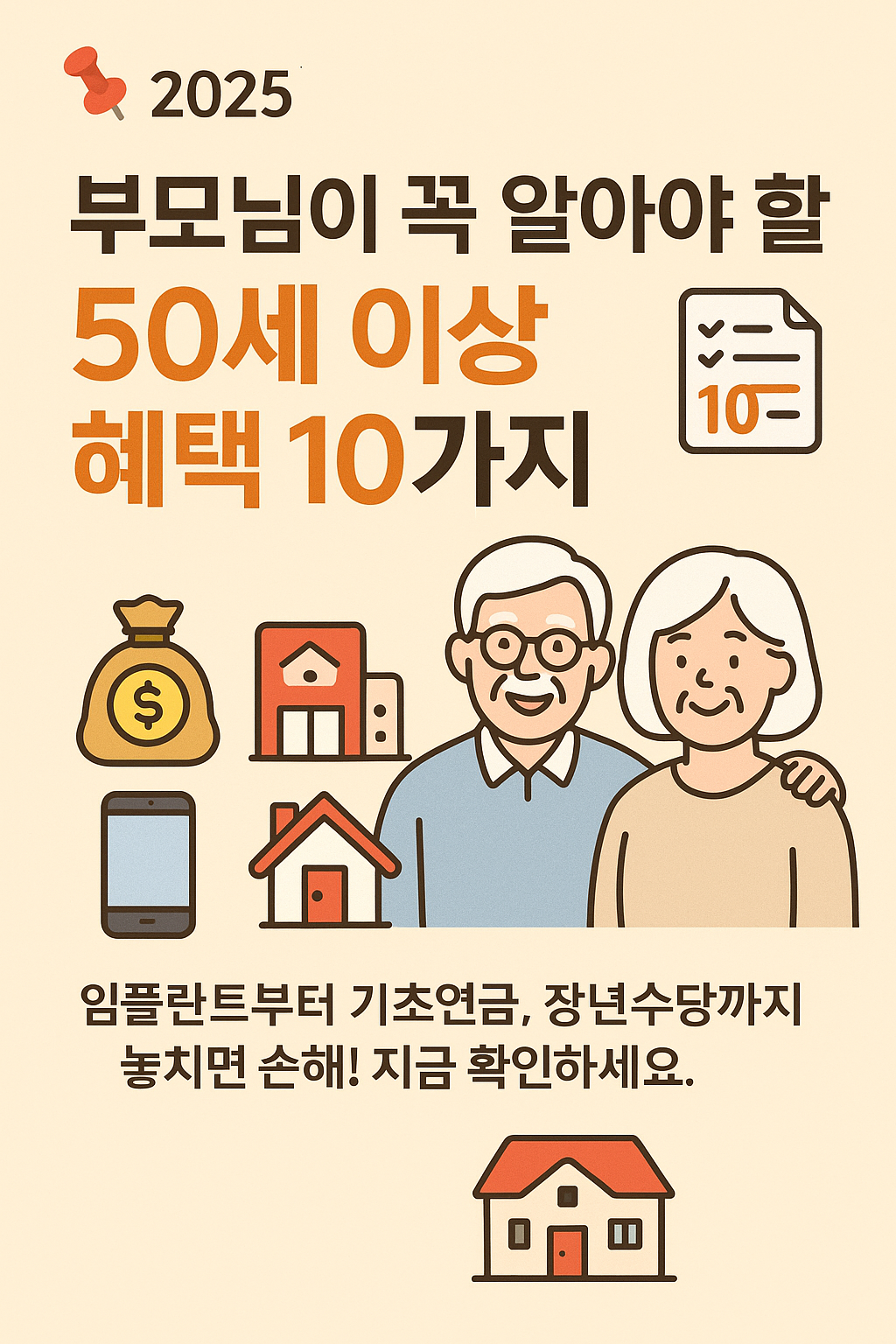 2025년은 중장년층에게 실질적인 혜택이 본격적으로 시행되는 해입니다. 50세 이상 부모님이 놓치지 않도록, 위 10가지 정책을 미리미리 확인하고 주민센터 또는 복지 앱을 통해 신청을 도와드리세요.